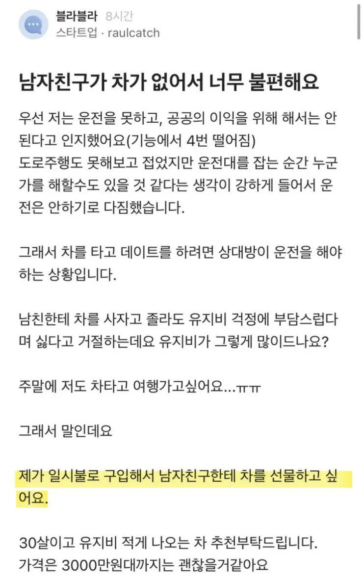 남자친구가 차가 없어서 너무 불편하다는 여성...