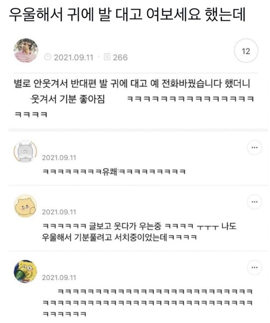 우울해서 귀에 발 대고 여보세요 했는데 |