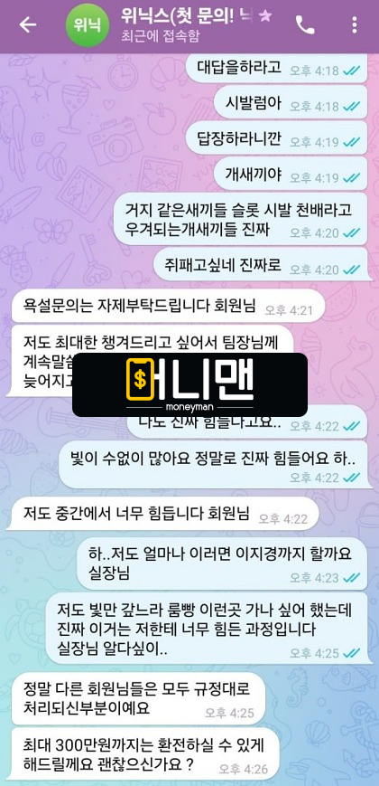 잃을 때는 아무 제재 없던 위닉스 고액 따니까 한순간에 먹튀사이트로 바뀝니다. 제가 주로 하는 종목이 바카라인데요. 이때까지 바카라로 하도 많이 잃어서 오랜만에 기분 전환으로 슬롯이나 돌려봤습니다. 천천히 즐기면서 하려고 바닥 600원짜리 돌리는데 스핀이 뜨더라고요. 그 뒤에 맥스가 나오면서 900만원이라는 당첨금을 먹었습니다. 진짜 오랜만에 이런 금액을 먹는 거라 너무 행복하더라고요. 그래서 기념으로 캡처하고 환전 신청을 했습니다. 그런데 이때까지 아무런 제재도 없다가 돈 좀 딴 거 같으니까 천배까지만 가능하다며 제재하더라고요. 저도 억울해서 따지고 별짓을 다 했지만 300만원만 환전 가능하다고 합니다. 그것도 6일에 걸쳐서 준다고 하더라고요. 돈 다 못 받는 것도 화나는데 돈도 한 번에 안 나온다니까 뚜껑이 열렸습니다. 그래서 팀장이랑 합의 보겠다고 말했더니 제 말을 무시하기 시작하더라고요. 그러다가 나중에는 자기들이 기분 나쁘다면서 하루에 10만원씩 환전해 준다고 합니다. 전부터 사이트 소문이 좋지는 않았지만 그래도 계속 이용해 왔던 곳이라 지금까지 이용하고 있었는데요. 제가 이런 꼴을 당하고 나서야 알면서도 계속 이용했다는 게 정말 후회가 되는 거 같습니다.