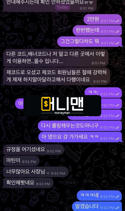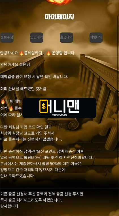 문자 홍보를 통해 실장 한 명을 알게 되고 사이트를 소개받았는데 그게 여기 플레임카지노 먹튀사이트 입니다. 처음에 20만원 입금 후 입플로 8만원 받고 배민 쿠폰으로 포인트 전환해서 총 33만원으로 게임을 시작했는데요. 이 사이트가 처음이라 느낌만 보려고 했던 거라 30만원을 만들고 롤링도 전부 다 채웠길래 환전 신청했습니다. 그런데 고객센터에서 마틴 배팅을 했다며 제재 대상이라고 하더라고요. 그래서 가입 코드 준 실장에게 연락했더니 저에게 작업하는 걸 느꼈습니다. 처음에는 모르는 척하더니 상황 말해주니까 자기 코드 아니었으면 몰수당했다네요. 어이가 없어서 2만원 한 번 마틴 했다고 하니까 마틴이 너무 많다며 제 잘못인 거처럼 몰아갑니다. 그러는 와중에 사이트에서 연락이 왔는데요. 충전 금액과 받은 포인트 금액을 더한만큼 재충전해서 롤링 50퍼센트를 돌리랍니다. 제가 잘못하는 거처럼 몰아가는 것도 부족했는지 추가 입금 요구와 추가 롤링까지 시키네요. 어차피 제가 시키는 대로 해봤자 다시 핑계 댈 게 뻔해 보이기 때문에 저는 거절했더니 보유금을 그대로 먹튀 했습니다. 그냥 똥 밟았다고 생각하고 넘기는 되는데 실장과 사이트가 짜고 치면서 농락하는 게 자꾸 생각이 나서 글 남기고 갑니다.